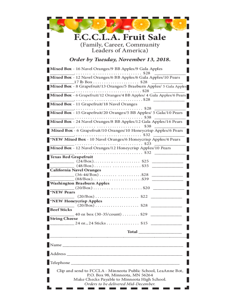 F.C.C.L.A. Fruit Sale (Family, Career, Community Leaders of America)Order by Tuesday, November 13, 2018. Mixed Box 16 Navel Oranges/9 BB Apples/9 Gala Apples ___. . . . . . . . .. . . . . . . . .