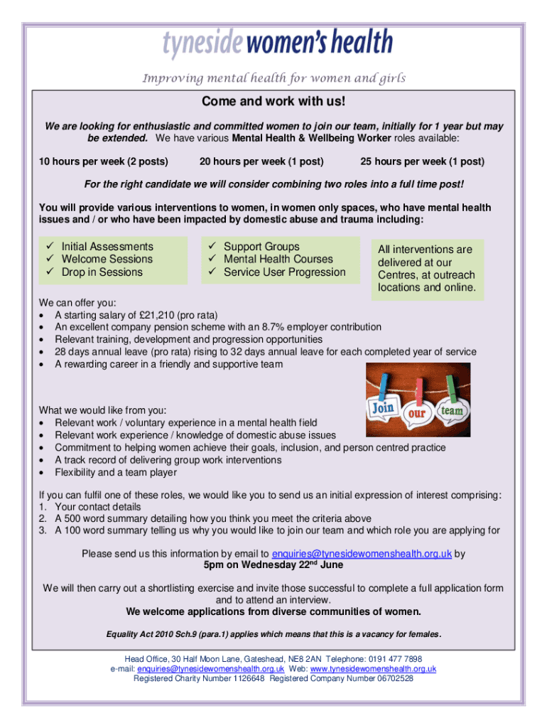Improving mental health for women and girlsCome and work with us! We are looking for enthusiastic and committed women to join our team, initially for 1 year but may be extended. We have various Mental