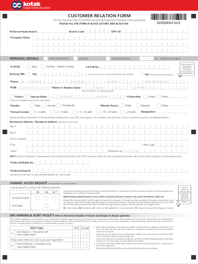 CUSTOMER RELATION FORM (For NonIndividual only) (To be lled by Authorised Signatory / Proprietor / Karta separately) PLEASE FILL THE FORM IN BLOCK LETTERS AND BLACK INK Preferred Home BranchBranch