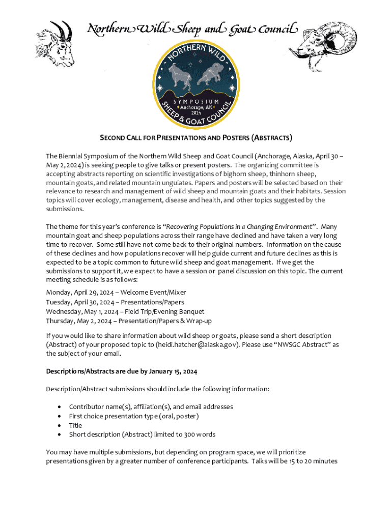 SECOND CALL FOR PRESENTATIONS AND POSTERS (ABSTRACTS) The Biennial Symposium of the Northern Wild Sheep and Goat Council (Anchorage, Alaska, April 30 May 2, 2024) is seeking people to give talks or