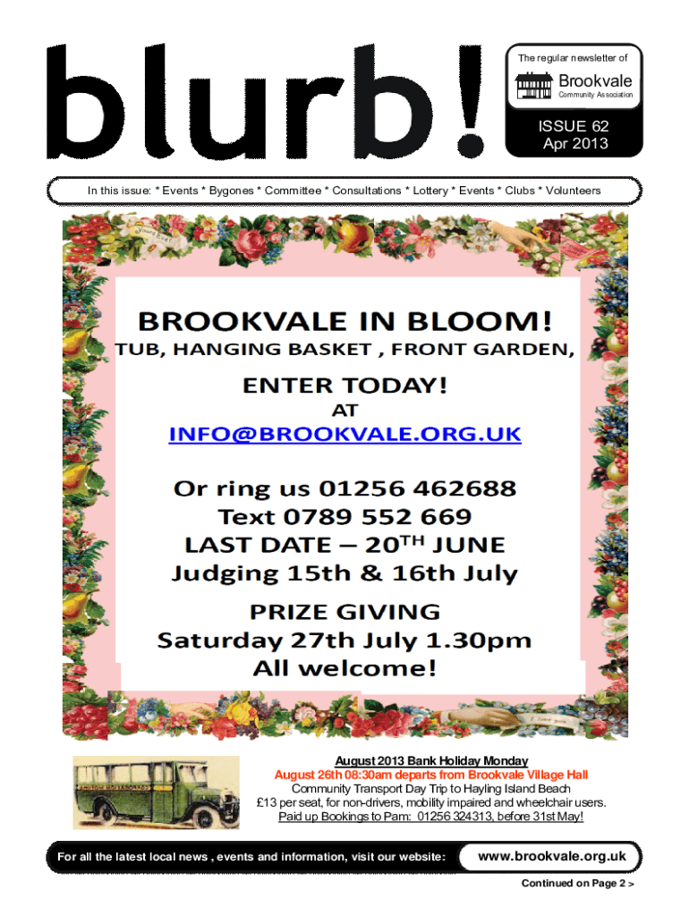 The regular newsletter ofBrookvale Community AssociationISSUE 62 Apr 2013 In this issue: * Events * Bygones * Committee * Consultations * Lottery * Events * Clubs * VolunteersAugust 2013 Bank Holiday