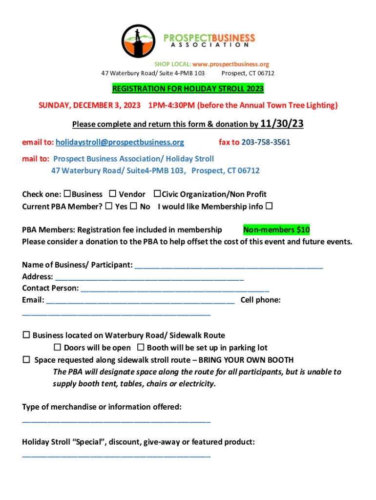 SHOP LOCAL: www.prospectbusiness.org 47 Waterbury Road/ Suite 4PMB 103 Prospect, CT 06712REGISTRATION FOR HOLIDAY STROLL 2023 SUNDAY, DECEMBER 3, 2023 1PM4:30PM (before the Annual Town Tree Lighting)