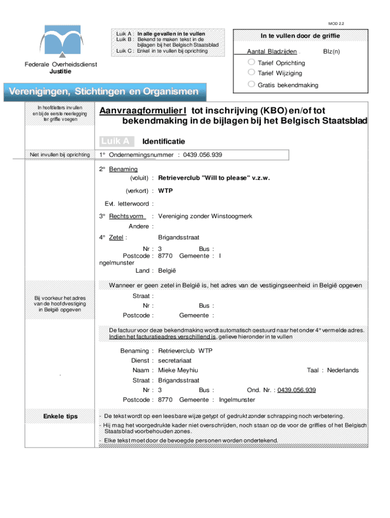 MOD 2.2Luik A : In alle gevallen in te vullen Luik B : Bekend te maken tekst in de bijlagen bij het Belgisch Staatsblad Luik C : Enkel in te vullen bij oprichtingBlz(n)Aanvraagformulier I tot inschrijving
