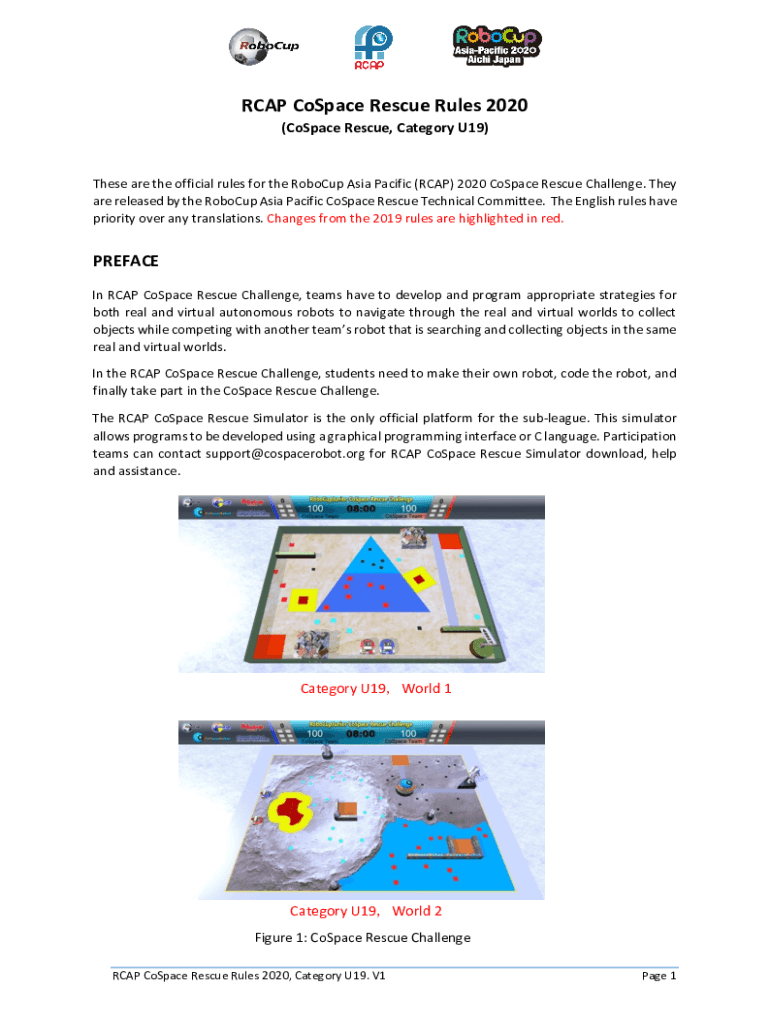 RCAP CoSpace Rescue Rules 2020 (CoSpace Rescue, Category U19)These are the official rules for the RoboCup Asia Pacific (RCAP) 2020 CoSpace Rescue Challenge. They are released by the RoboCup Asia Pacific
