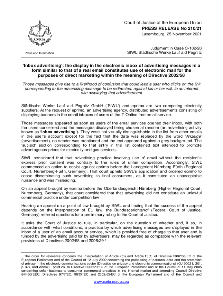 Court of Justice of the European Union PRESS RELEASE No 210/21 Luxembourg, 25 November 2021Press and InformationJudgment in Case C102/20 StWL Stdtische Werke Lauf a.d PegnitzInbox advertising: the