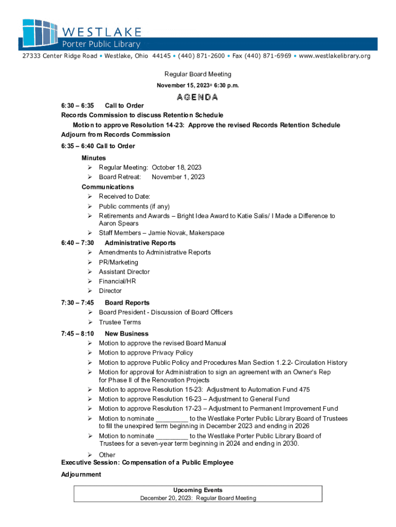 27333 Center Ridge Road Westlake, Ohio 44145 (440) 8712600 Fax (440) 8716969 www.westlakelibrary.orgRegular Board Meeting
