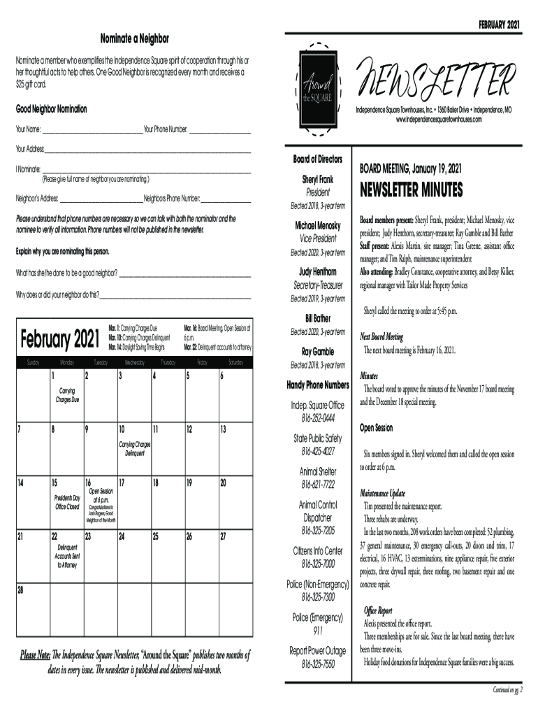FEBRUARY 2021Nominate a Neighbor Nominate a member who exemplifies the Independence Square spirit of cooperation through his or her thoughtful acts to help others. One Good Neighbor is recognized