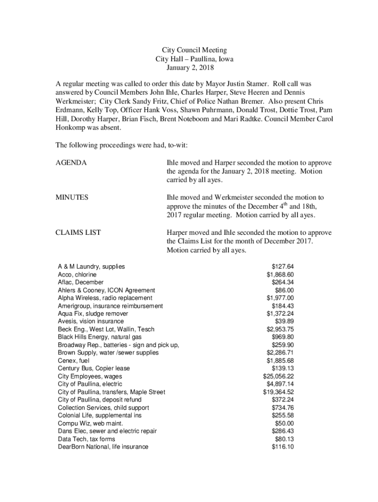 City Council Meeting City Hall Paullina, Iowa January 2, 2018 A regular meeting was called to order this date by Mayor Justin Stamer. Roll call was answered by Council Members John Ihle, Charles Harper,