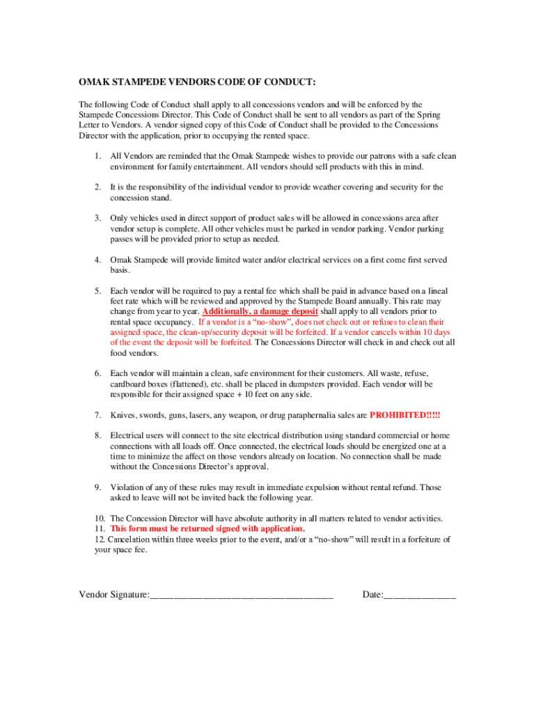 OMAK STAMPEDE VENDORS CODE OF CONDUCT: The following Code of Conduct shall apply to all concessions vendors and will be enforced by the Stampede Concessions Director. This Code of Conduct shall be