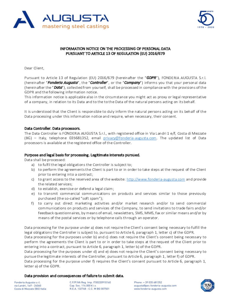 INFORMATION NOTICE ON THE PROCESSING OF PERSONAL DATA PURSUANT TO ARTICLE 13 OF REGULATION (EU) 2016/679Dear Client, Pursuant to Article 13 of Regulation (EU) 2016/679 (hereinafter the GDPR), FONDERIA