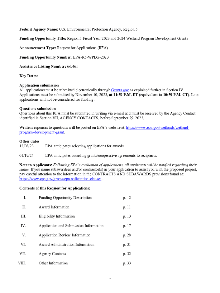 Federal Agency Name: U.S. Environmental Protection Agency, Region 5 Funding Opportunity Title: Region 5 Fiscal Year 2023 and 2024 Wetland Program Development Grants Announcement Type: Request for