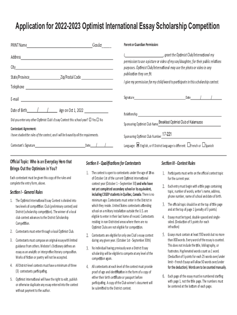 Get the free Application for 20 -22 20 32 Optimist International Essay Contest
