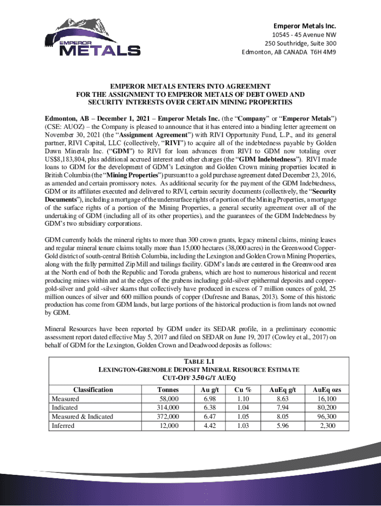 Get the free Emperor Metals Terminates Agreement for the Assignment ...