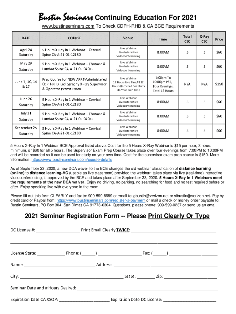 Bustin Seminars Continuing Education For 2021 www.bustinseminars.com To Check CDPHRHB & CA BCE Requirements DATECOURSEVenueTimeTotal CECXRay CECPriceApril 24 Saturday5 Hours XRay In 1 Webinar Cervical