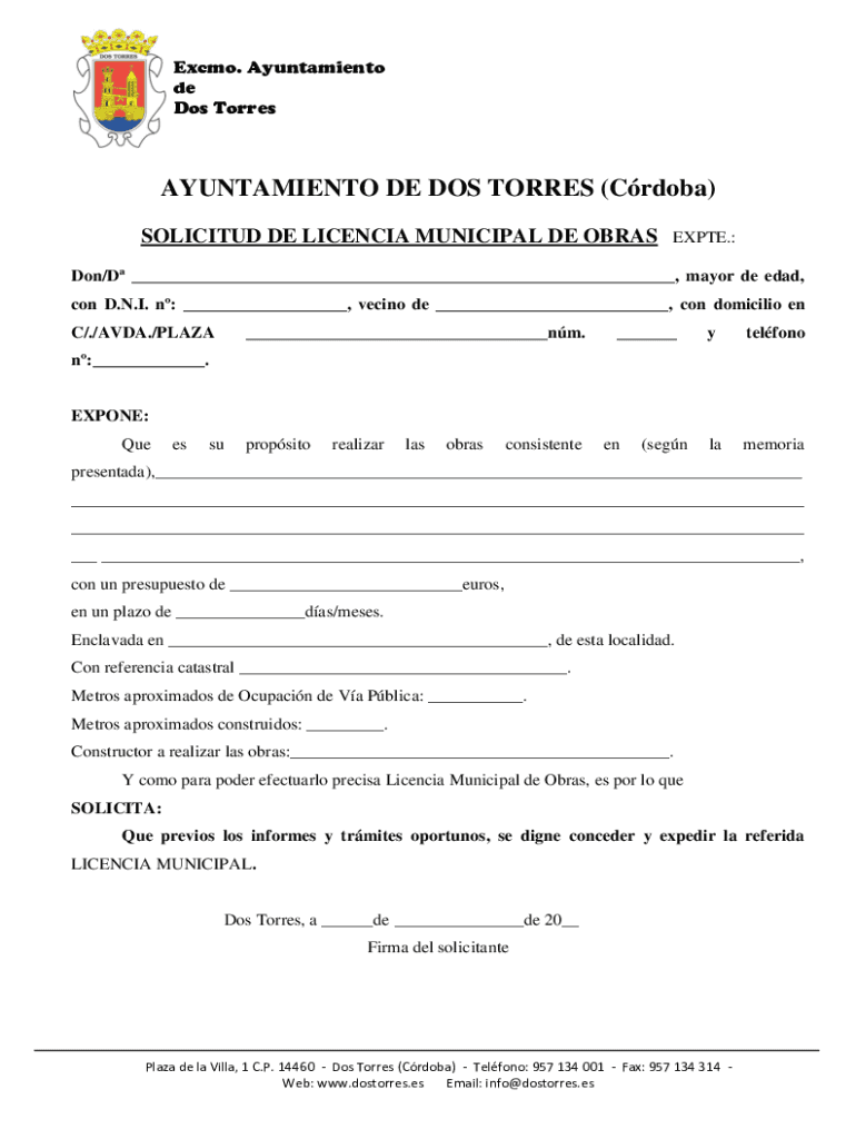 Excmo. Ayuntamiento de Dos TorresAYUNTAMIENTO DE DOS TORRES (Crdoba) SOLICITUD DE LICENCIA MUNICIPAL DE OBRASEXPTE.:Don/D ___, mayor de edad, con D.N.I. n: ___, vecino de ___, con domicilio en C/./AVDA./PLAZA___nm.___ytelfonolamemorian:___.EXPONE: