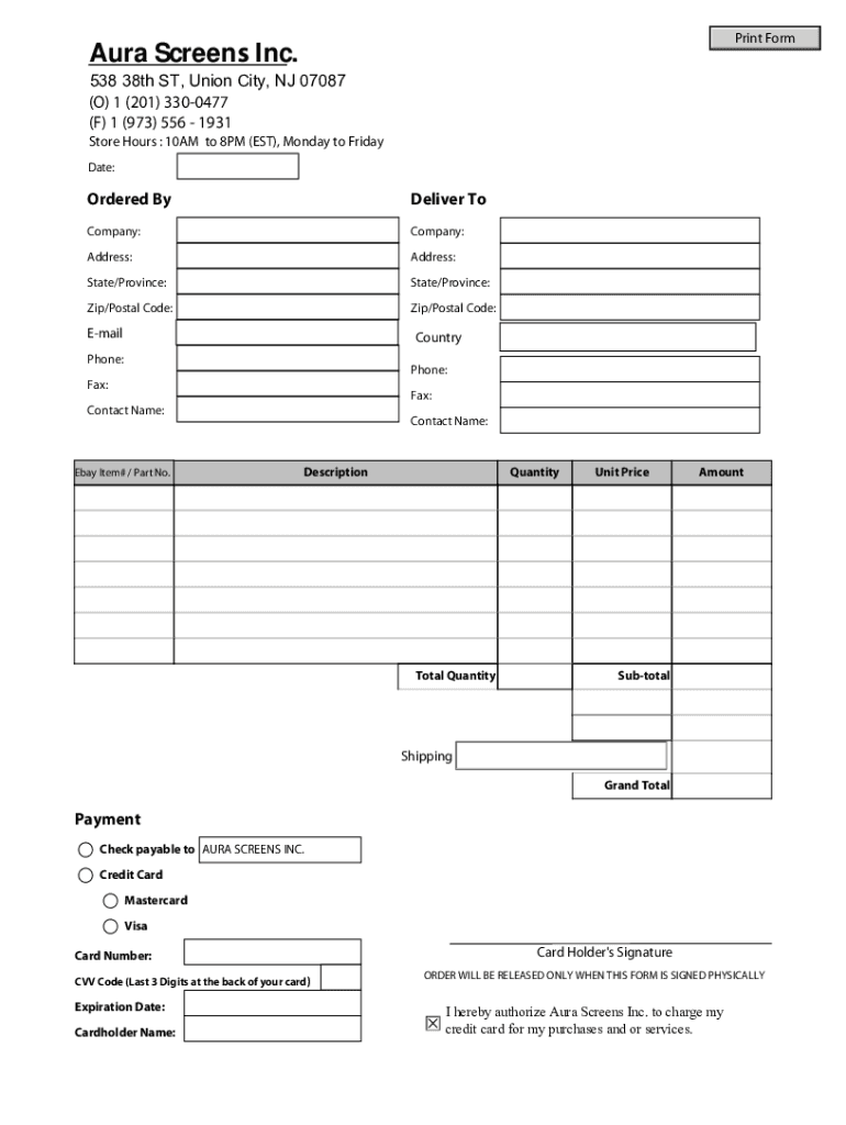 Print FormAura Screens Inc. 538 38th ST, Union City, NJ 07087 (O) 1 (201) 3300477 (F) 1 (973) 556 1931 Store Hours : 10AM to 8PM (EST), Monday to Friday Date:Ordered ByDeliver ToCompany:Company:Address:Address:State/Province:State/Province:Zip/Postal