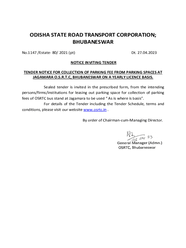 ODISHA STATE ROAD TRANSPORT CORPORATION; BHUBANESWAR No.1147 /Estate 80/ 2021 (pt)Dt. 27.04.2023NOTICE INVITING TENDER TENDER NOTICE FOR COLLECTION OF PARKING FEE FROM PARKING SPACES AT JAGAMARA O.S.R.T.C,