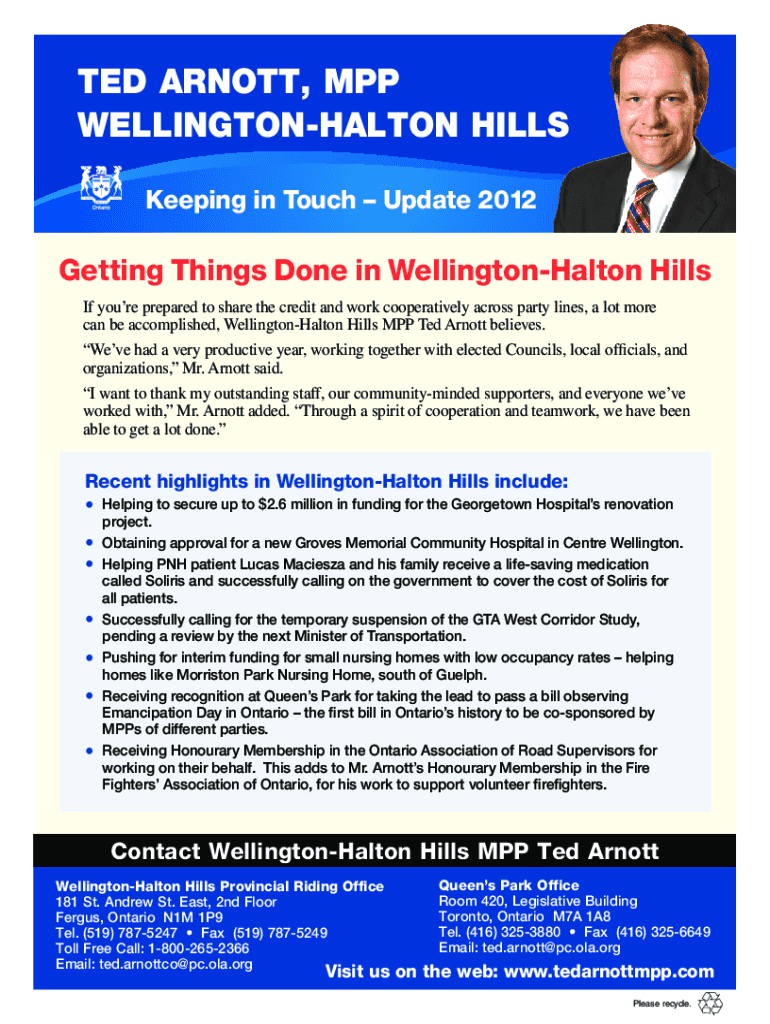 Wellingtonhalton hills MPP Ted ArnottTed Arnott, MPP wellingtonHalton hills Keeping in Touch Update 2012Getting Things Done in WellingtonHalton Hills If youre prepared to share the credit and work