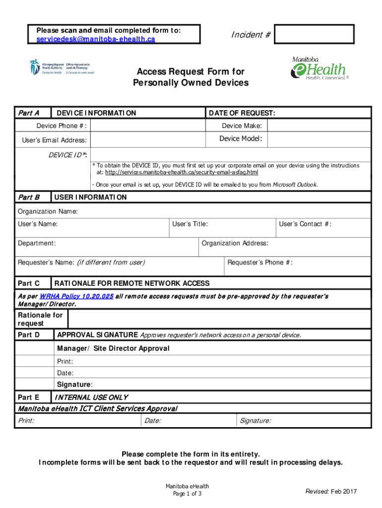 Please scan and email completed form to: servicedesk@manitobaehealth.caIncident #Access Request Form for Personally Owned Devices Part ADEVICE INFORMATIONDATE OF REQUEST:Device Phone #:Device Make:Users