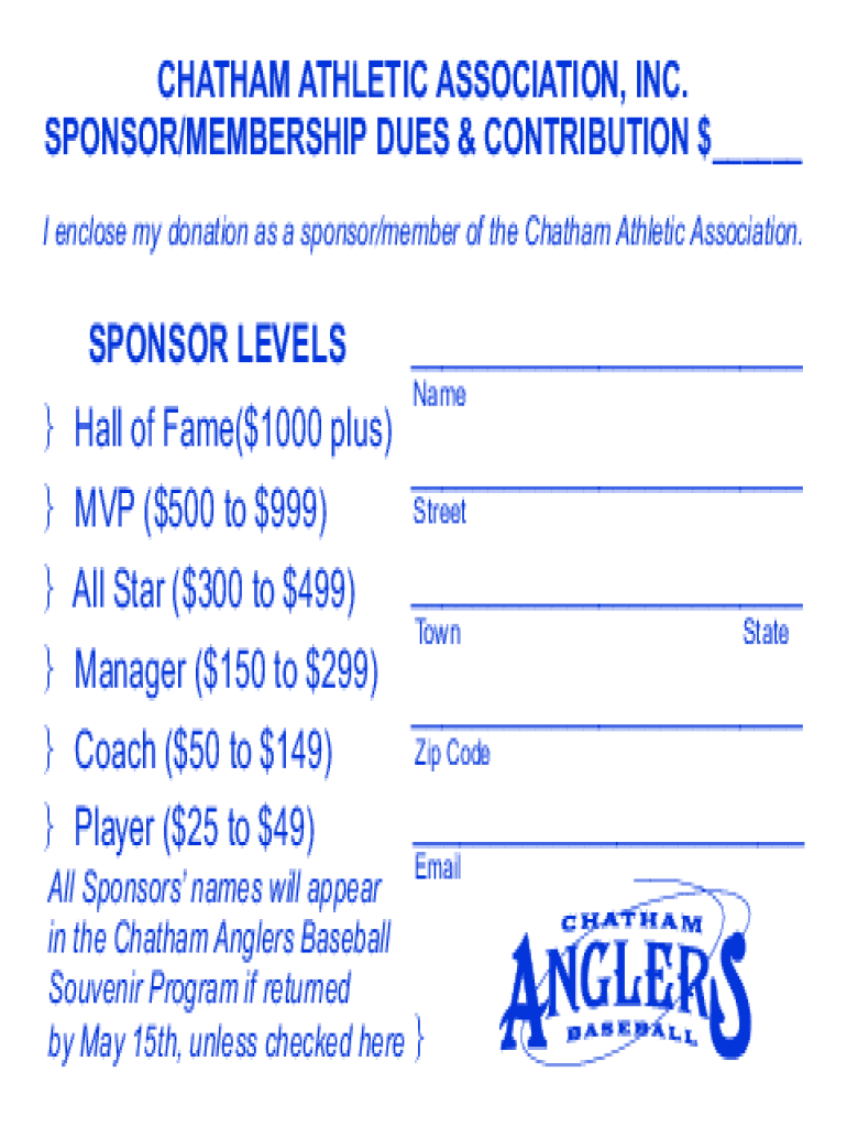 CHATHAM ATHLETIC ASSOCIATION, INC. SPONSOR/MEMBERSHIP DUES & CONTRIBUTION $___ I enclose my donation as a sponsor/member of the Chatham Athletic Association.SPONSOR LEVELS___ Name Hall of Fame($1000