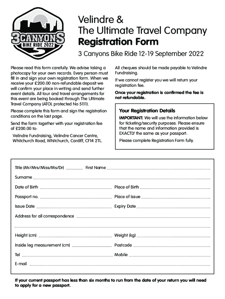 Velindre & The Ultimate Travel Company Registration Form 3 Canyons Bike Ride 1219 September 2022 Please read this form carefully. We advise taking a photocopy for your own records. Every person must