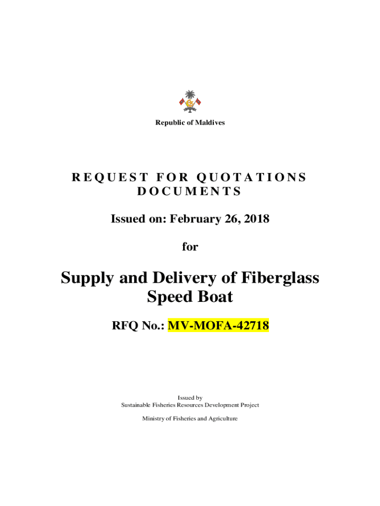 Republic of MaldivesREQUEST FOR QUOTATIONS DOCUMENTS Issued on: February 26, 2018 forSupply and Delivery of Fiberglass Speed Boat RFQ No.: MVMOFA42718Issued by Sustainable Fisheries Resources Development