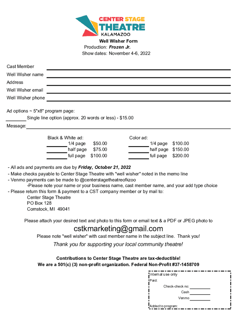 Well Wisher Form Production: Frozen Jr. Show dates: November 46, 2022 Cast Member Well Wisher name Address Well Wisher email Well Wisher phone Ad options 5\"x8\" program page: Single line option (approx.
