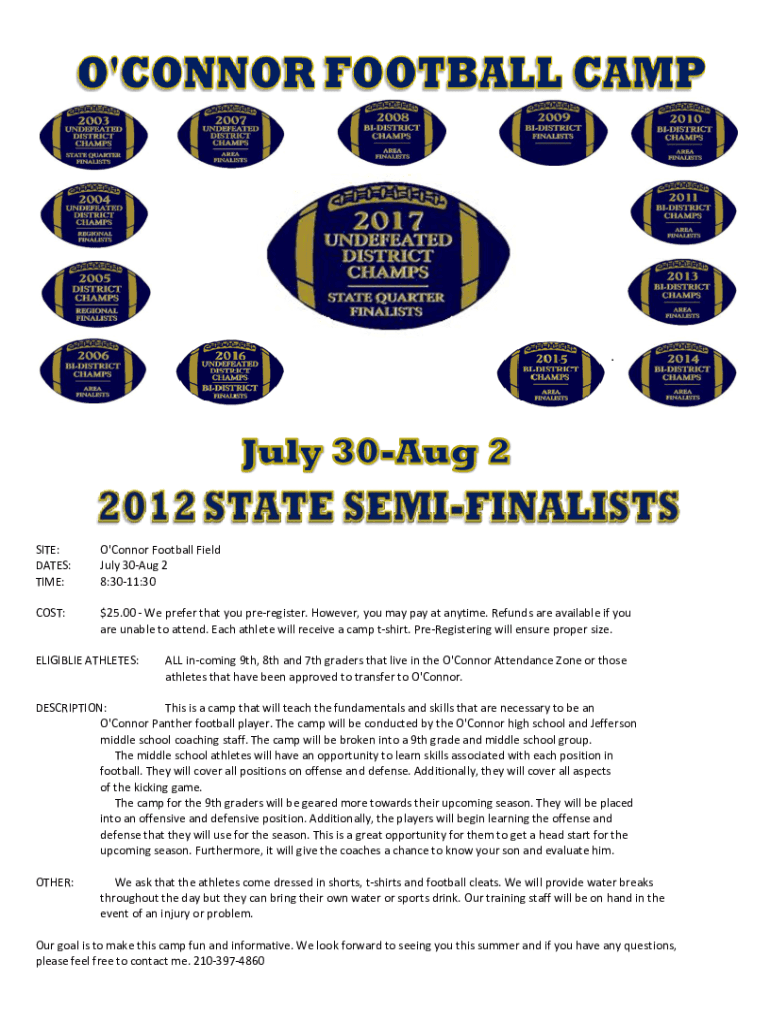 SITE: DATES: TIME:O\'Connor Football Field July 30Aug 2 8:3011:30COST:$25.00 We prefer that you preregister. However, you may pay at anytime. Refunds are available if you are unable to attend. Each