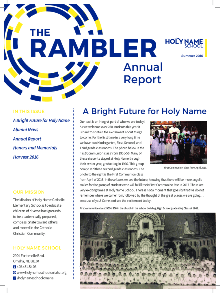 THERAMBLERSummer 2016Annual ReportIN THIS ISSUEA Bright Future for Holy Name Alumni News Annual Report Honors and Memorials Harvest 2016OUR MISSION The Mission of Holy Name Catholic Elementary School
