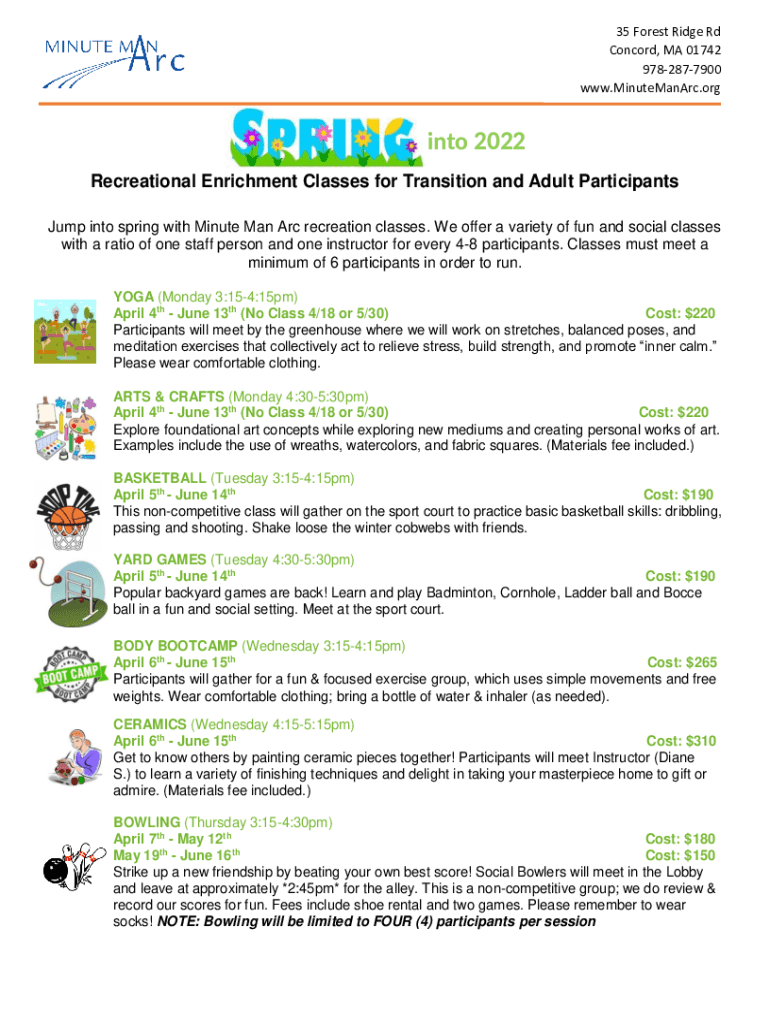35 Forest Ridge Rd Concord, MA 01742 9782877900 www.MinuteManArc.orginto 2022 Recreational Enrichment Classes for Transition and Adult Participants Jump into spring with Minute Man Arc recreation