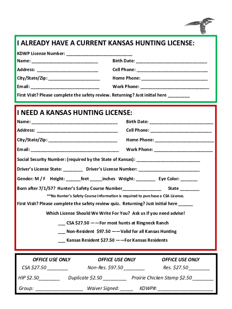 I ALREADY HAVE A CURRENT KANSAS HUNTING LICENSE: KDWP License Number: ___ Name: ___ Birth Date: ___ Address: ___Cell Phone: ___City/State/Zip: ___Home Phone: ___Email: ___Work Phone: ___First Visit?