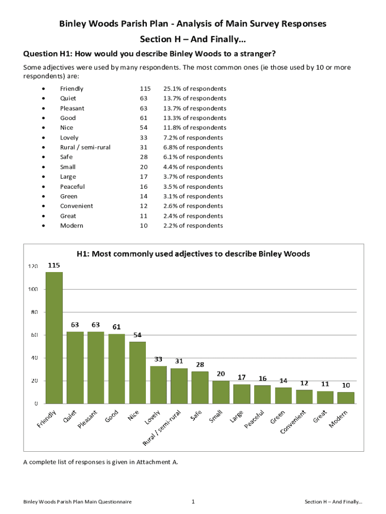 Binley Woods Parish Plan Analysis of Main Survey Responses Section H And Finally Question H1: How would you describe Binley Woods to a stranger? Some adjectives were used by many respondents. The