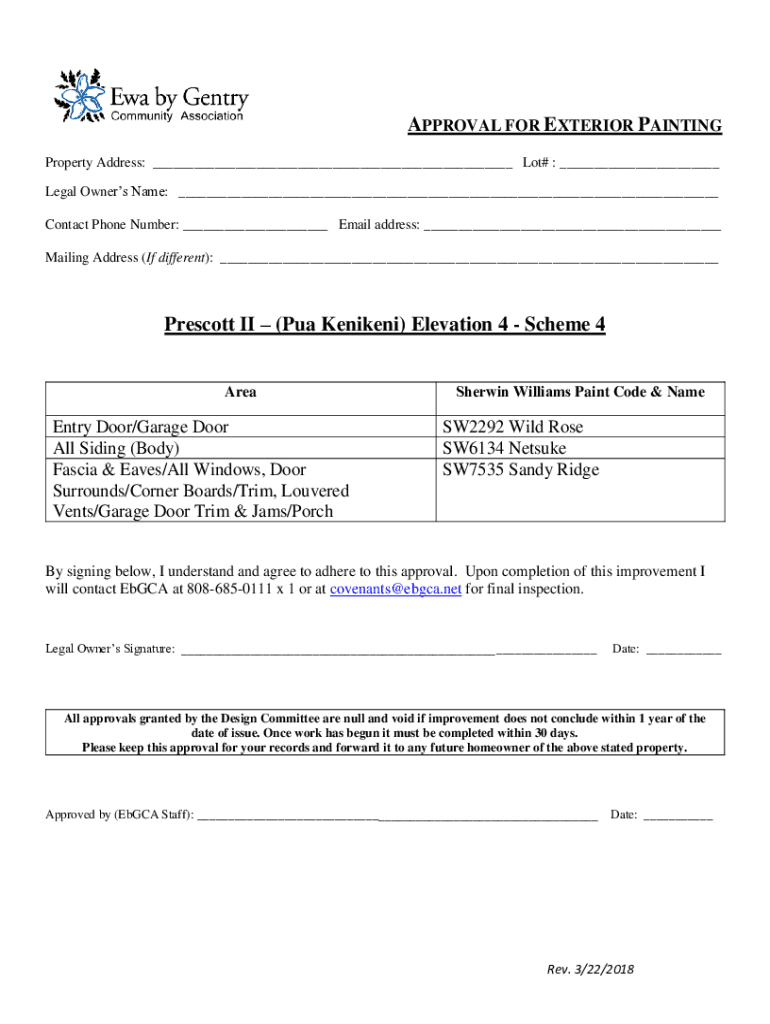 APPROVAL FOR EXTERIOR PAINTING Property Address: ___ Lot# : ___ Legal Owners Name: ___ Contact Phone Number: ___ Email address: ___ Mailing Address (If different): ___Prescott II (Pua Kenikeni) Elevation