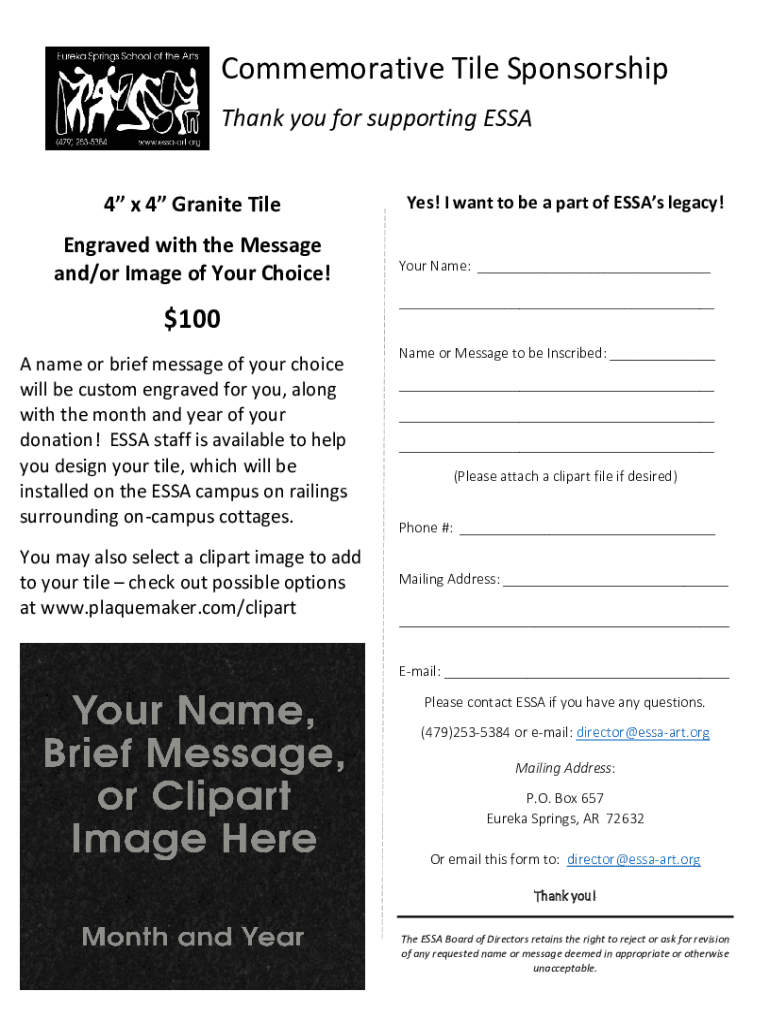 Commemorative Tile Sponsorship Thank you for supporting ESSA 4 x 4 Granite Tile Engraved with the Message and/or Image of Your Choice!$100 A name or brief message of your choice will be custom engraved