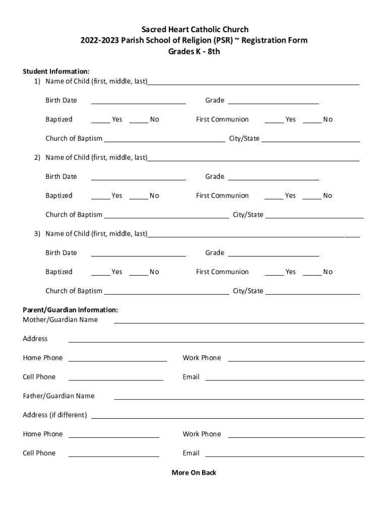 Sacred Heart Catholic Church 20222023 Parish School of Religion (PSR) Registration Form Grades K 8th Student Information: 1) Name of Child (first, middle, last)___ Birth Date___Baptized___ Yes ___
