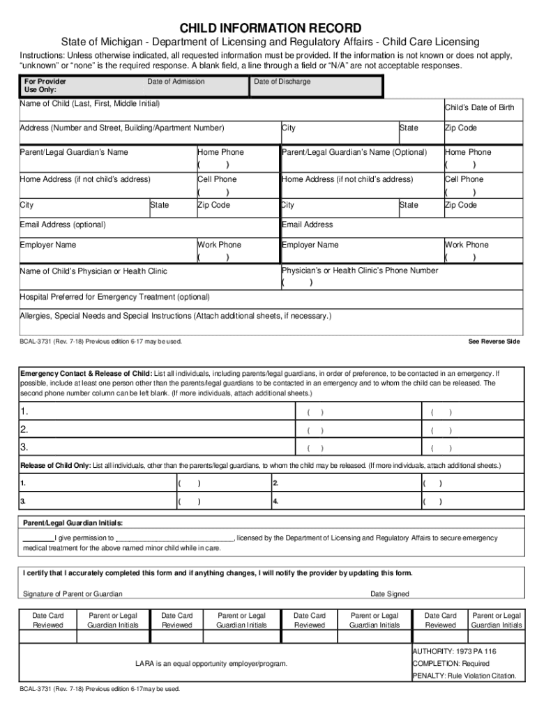 CHILD INFORMATION RECORD State of Michigan Department of Licensing and Regulatory Affairs Child Care Licensing Instructions: Unless otherwise indicated, all requested information must be provided.