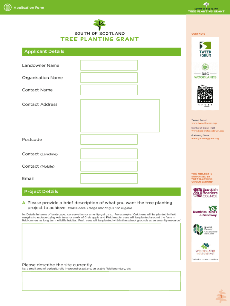 Application FormCONTACTSApplicant Details Landowner Name Organisation Name Contact NameContact AddressTweed Forum www.tweedforum.org Borders Forest Trust www.bordersforesttrust.orgPostcodeGalloway