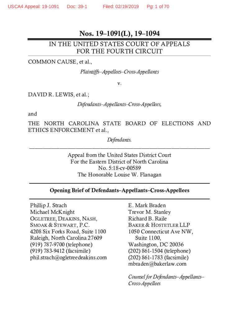 USCA4 Appeal: 191091Doc: 391Filed: 02/19/2019Pg: 1 of 70Nos. 191091(L), 191094 IN THE UNITED STATES COURT OF APPEALS FOR THE FOURTH CIRCUIT COMMON CAUSE, et al., PlaintiffsAppelleesCrossAppellants