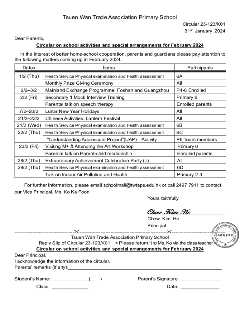 Tsuen Wan Trade Association Primary School Circular 23123/K01 31st January 2024 Dear Parents, Circular on school activities and special arrangements for February 2024 In the interest of better homeschool