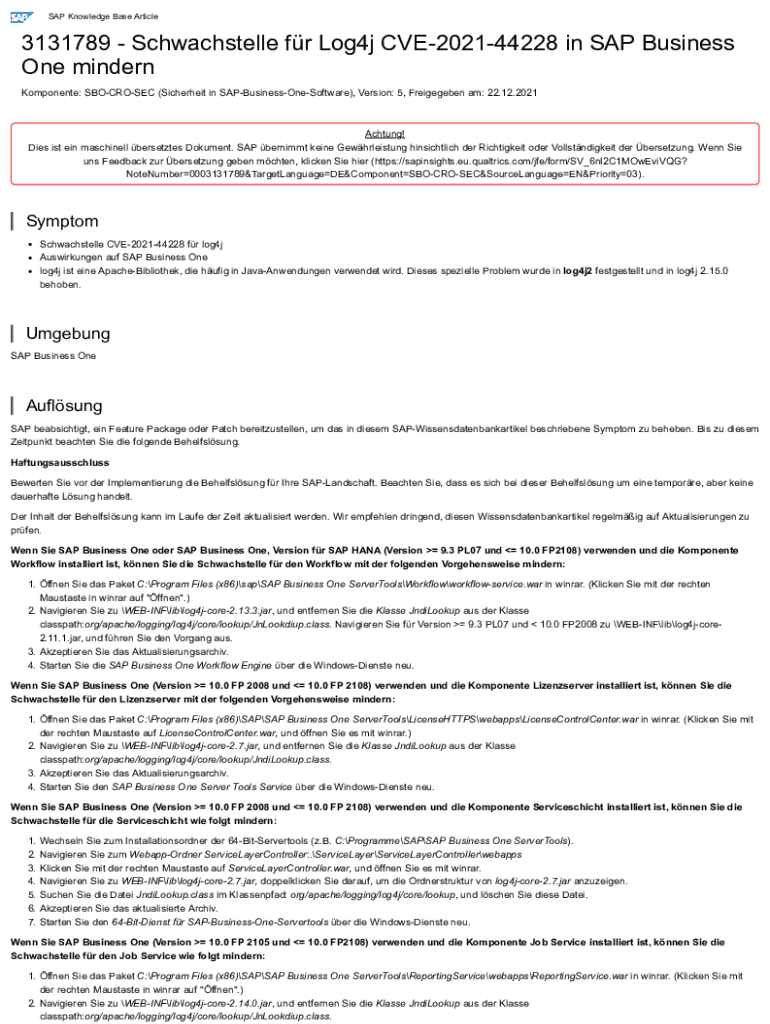 SAP Knowledge Base Article3131789 Schwachstelle fr Log4j CVE202144228 in SAP Business One mindern Komponente: SBOCROSEC (Sicherheit in SAPBusinessOneSoftware), Version: 5, Freigegeben am: 22.12.2021Achtung!