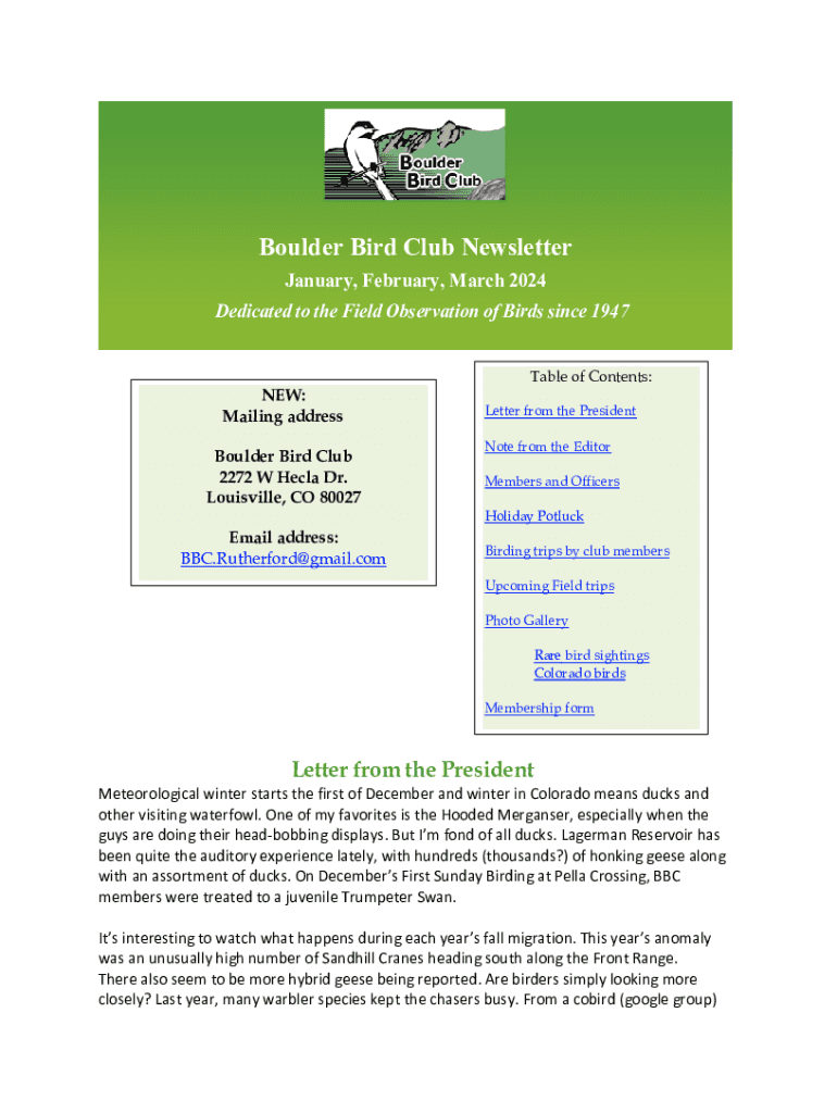 Boulder Bird Club Newsletter January, February, March 2024 Dedicated to the Field Observation of Birds since 1947NEW: Mailing address Boulder Bird Club 2272 W Hecla Dr. Louisville, CO 80027Table of