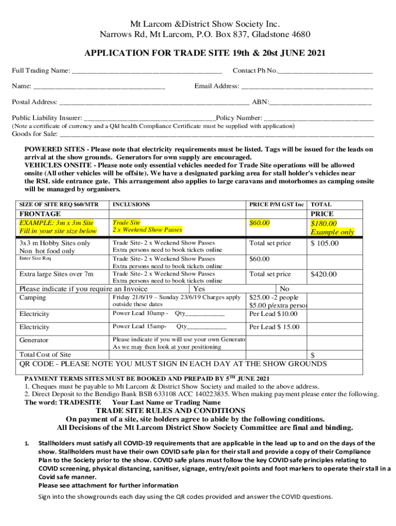 Mt Larcom &District Show Society Inc. Narrows Rd, Mt Larcom, P.O. Box 837, Gladstone 4680 APPLICATION FOR TRADE SITE 19th & 20st JUNE 2021 Full Trading Name: ___ Name: ___Contact Ph No.___Email Address: