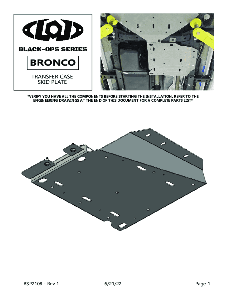 BLACKOPS SERIESBRONCO TRANSFER CASE SKID PLATE *VERIFY YOU HAVE ALL THE COMPONENTS BEFORE STARTING THE INSTALLATION. REFER TO THE ENGINEERING DRAWINGS AT THE END OF THIS DOCUMENT FOR A COMPLETE PARTS