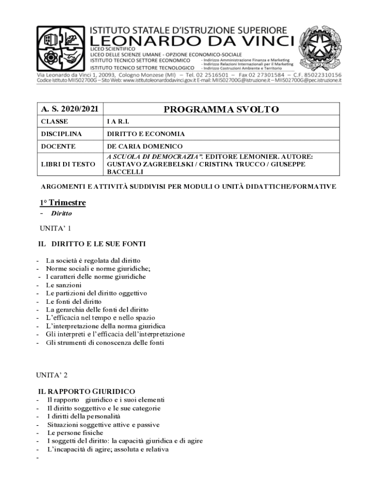 PROGRAMMA SVOLTOA. S. 2020/2021 CLASSEI A R.I.DISCIPLINADIRITTO E ECONOMIADOCENTEDE CARIA DOMENICOLIBRI DI TESTOA SCUOLA DI DEMOCRAZIA. EDITORE LEMONIER. AUTORE: GUSTAVO ZAGREBELSKI / CRISTINA TRUCCO