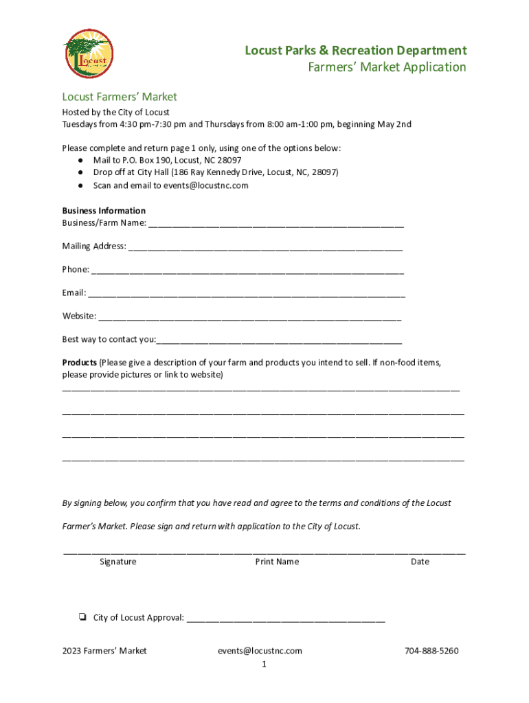 Locust Parks & Recreation Department Farmers Market Application Locust Farmers Market Hosted by the City of Locust Tuesdays from 4:30 pm7:30 pm and Thursdays from 8:00 am1:00 pm, beginning May 2nd