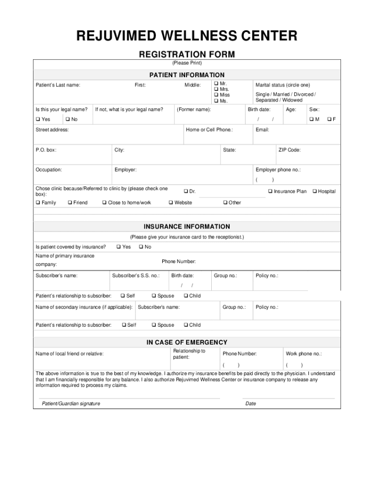 REJUVIMED WELLNESS CENTER REGISTRATION FORM (Please Print)PATIENT INFORMATION Patients Last name:Is this your legal name? YesFirst:Middle:If not, what is your legal name? Mr. Mrs. Miss Ms.Marital