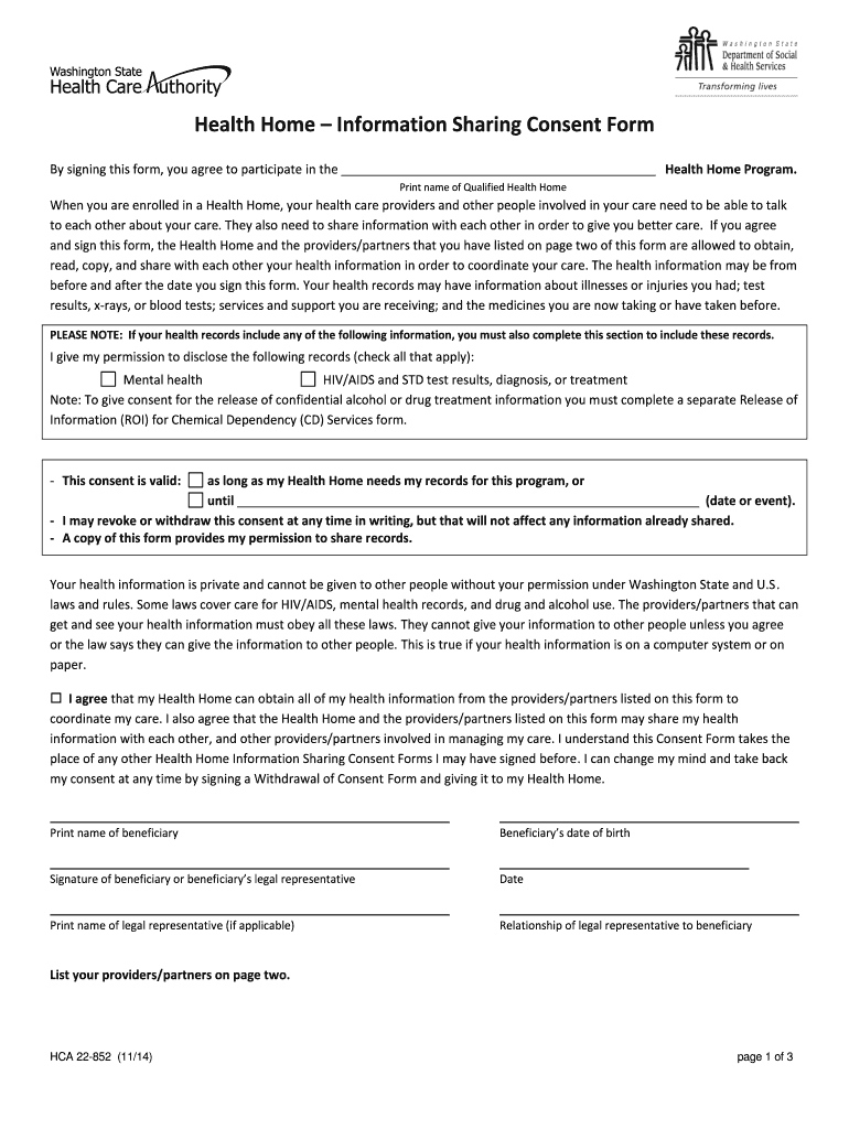 Health Home Information Sharing Consent Form By signing this form, you agree to participate in the Health Home Program. Print name of Qualified Health Home When you are enrolled in a Health Home,