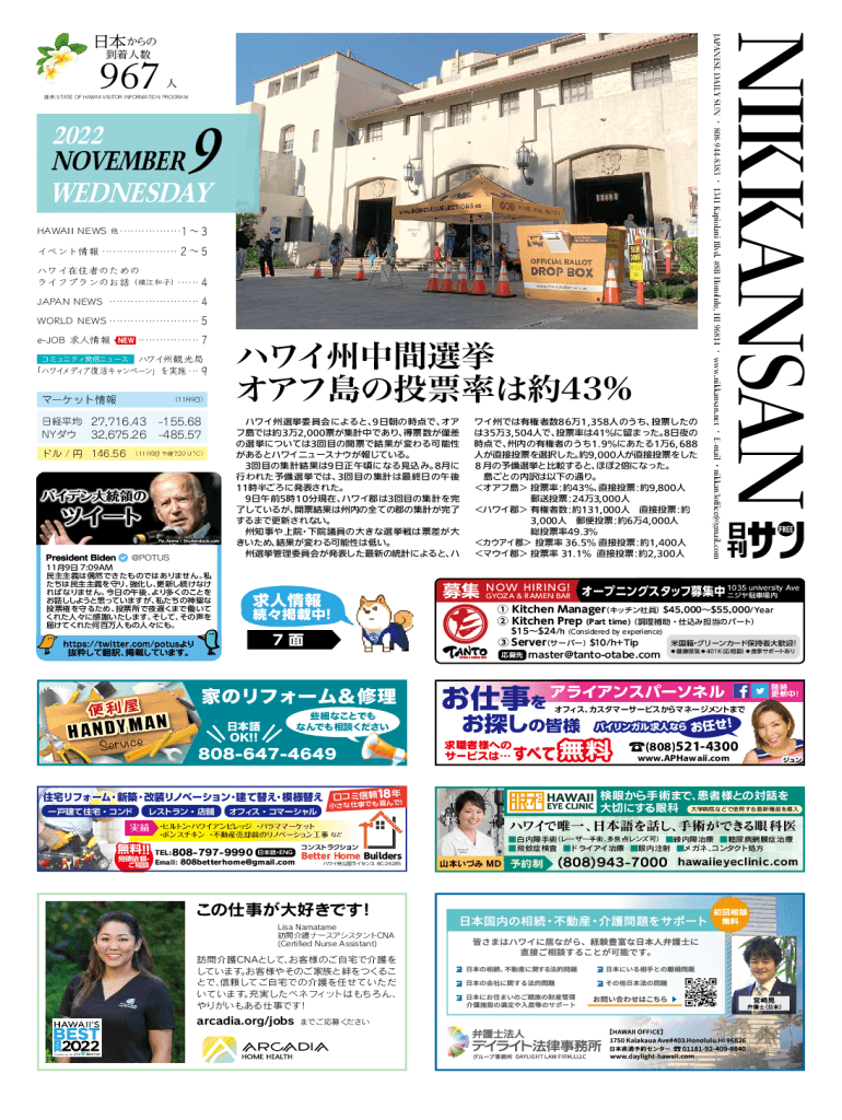 967STATE OF HAWAII VISITOR INFORMATION PROGRAM92022NOVEMBER WEDNESDAY HAWAII NEWS..................13...................... 2 5 ....... 4 JAPAN NEWS .......................... 4 WORLD NEWS..........................