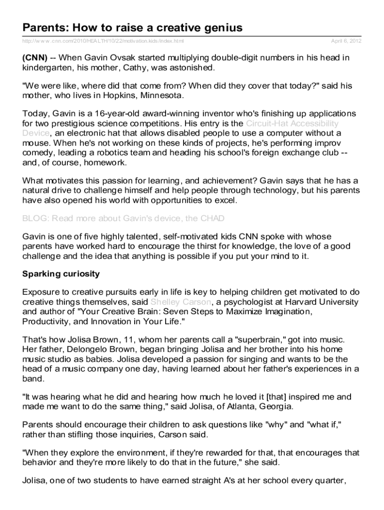 Parents: How to raise a creative genius http://w w w .cnn.com/2010/HEALTH/10/22/motivation.kids/index.htmlApril 6, 2012(CNN) When Gavin Ovsak started multiplying doubledigit numbers in his head in