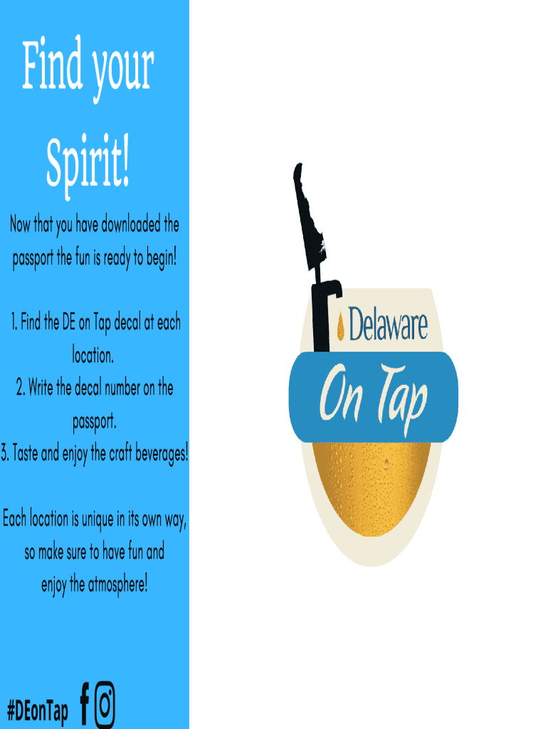 Find your Spirit! Now that you have downloaded the passport the fun is ready to begin!1. Find the DE on Tap decal at each location. 2. Write the decal number on the passport. 3. Taste and enjoy the